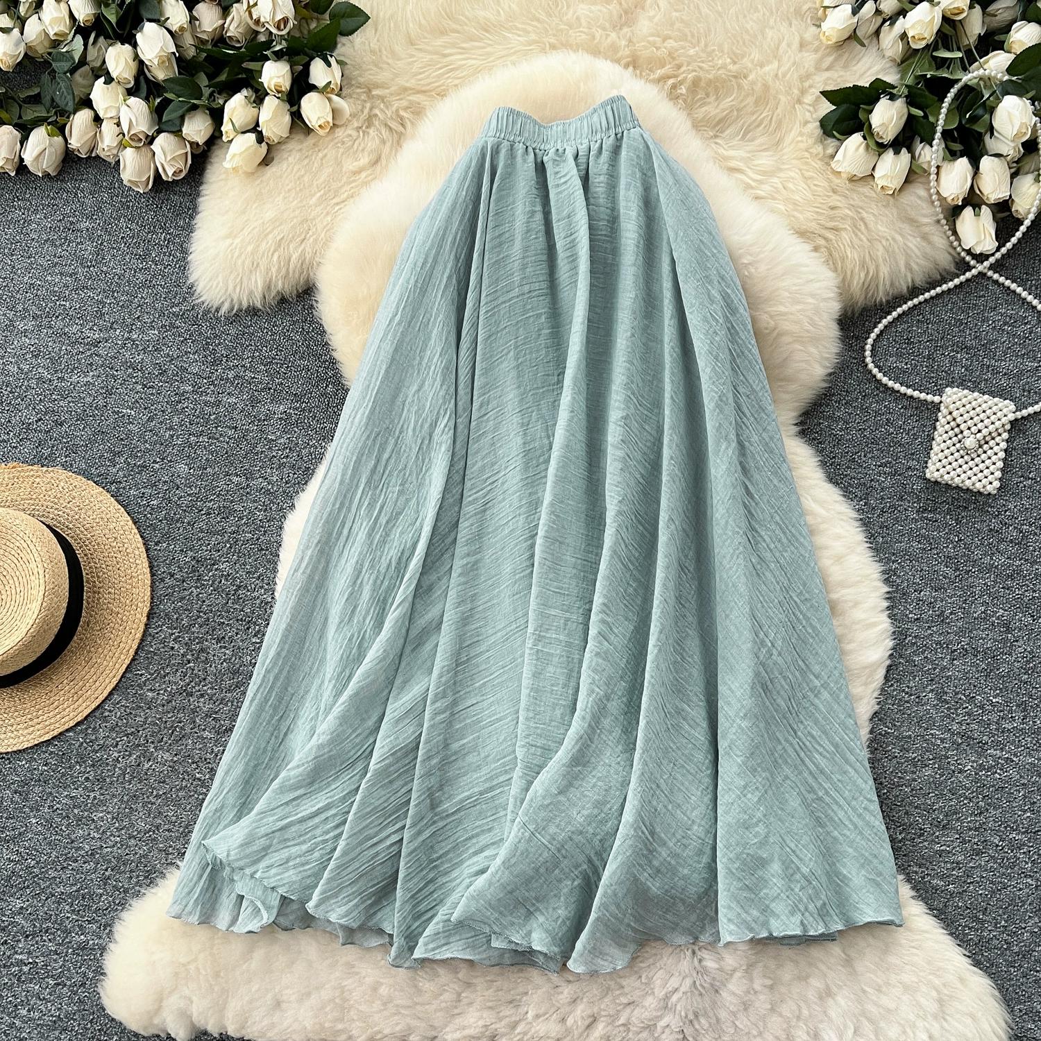 Летняя женская шикарная хлопково-льняная однотонная длинная юбка макси с эластичной талией XL серо голубой