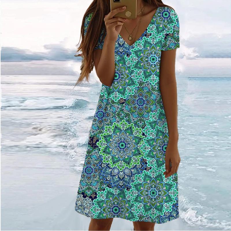 Летняя мода женские V-образный вырез короткий рукав ретро узор напечатанное платье сексуальные короткие юбки платья 8XL зелёный