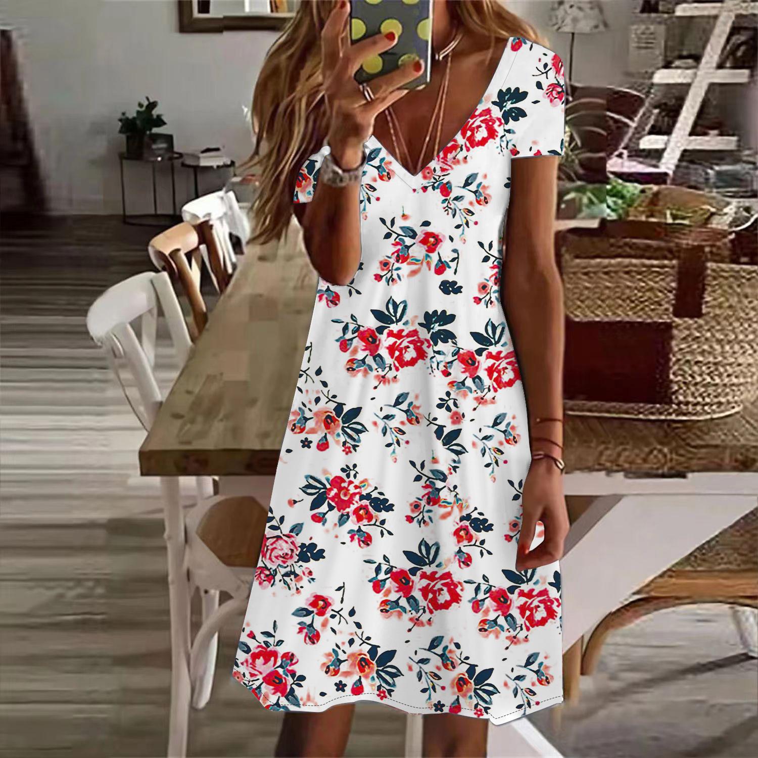 Летняя мода женское платье с V-образным вырезом и коротким рукавом с принтом красных роз сексуальное платье 8XL красный