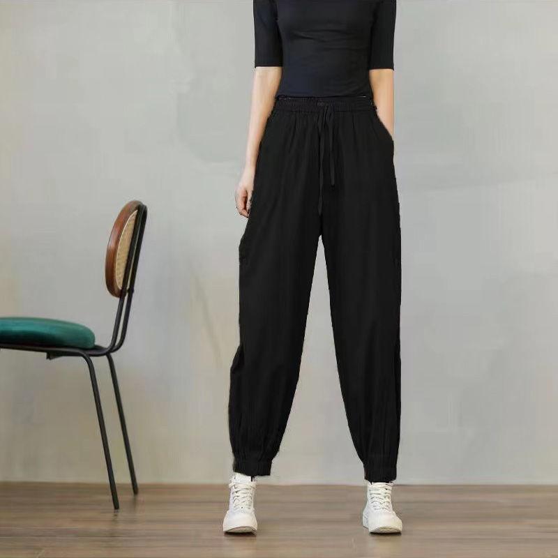 Летняя новая свободная корейская версия повседневных брюк Harlan, шаровары с эластичной резинкой на талии и шнурком S чёрный
