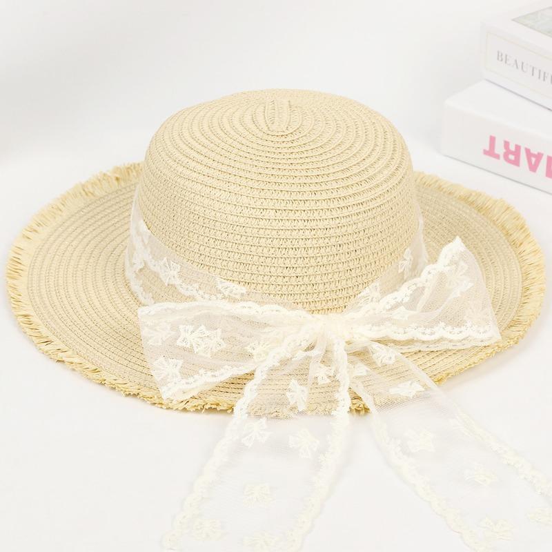 Летняя новая соломенная шляпа с кружевом и бантом, плоская тулья, солнцезащитная, женская, для улицы, с большими полями, шляпа с милыми лентами adult hat, hat circumference is about 60cm молочный белый