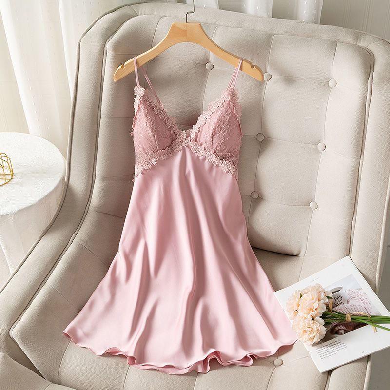 Летняя сексуальная тонкая пижама с открытой спиной, кружевная женская однотонная элегантная ночная рубашка из ледяного шелка, новая женская домашняя одежда с открытыми подтяжками 2XL розовый