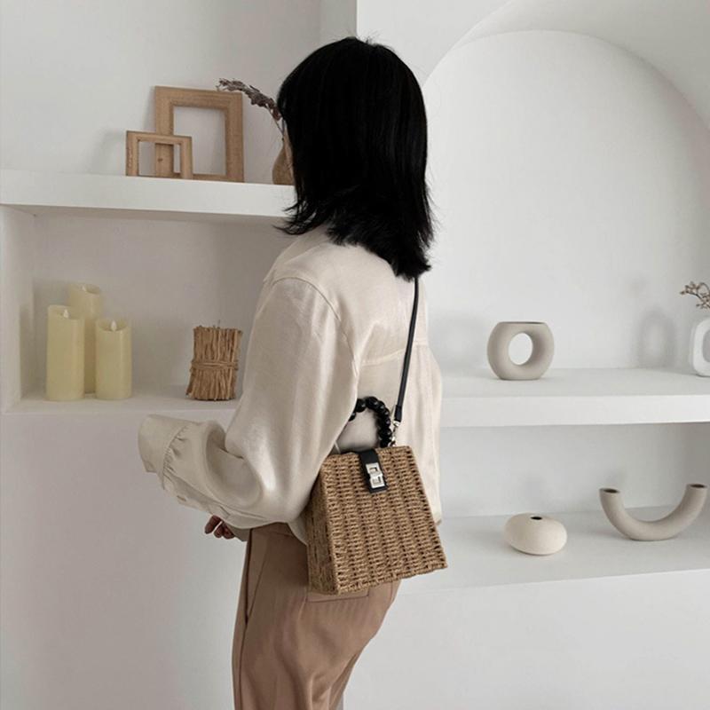 Летняя сумка-коробка из гранулированного материала, женская, соломенная, пляжная, праздничная, сумки через плечо, дорожные сумки для покупок, сумки-тоут с ручкой и карманом