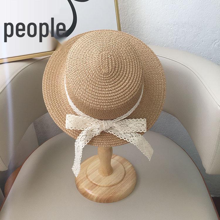 Летняя шляпа от солнца для девочек с кружевом и бантом - Пляжная шляпа с плоскими полями для младенцев и детей 50-52 CM