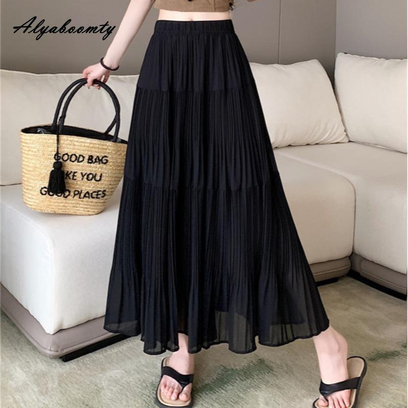 Летняя юбка миди плиссе в стиле фейрикор для женщин, с высокой талией, черная, белая, бежевая, фиолетовая, с оборками, элегантная, женственная, базовая юбка для леди One Size чёрный