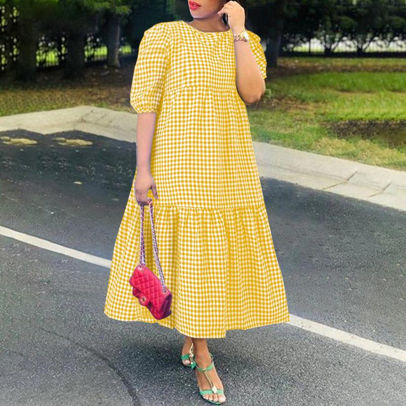 Лето Женщины с коротким рукавом Клетчатый Слойка Плев Свободное длинное платье FZH