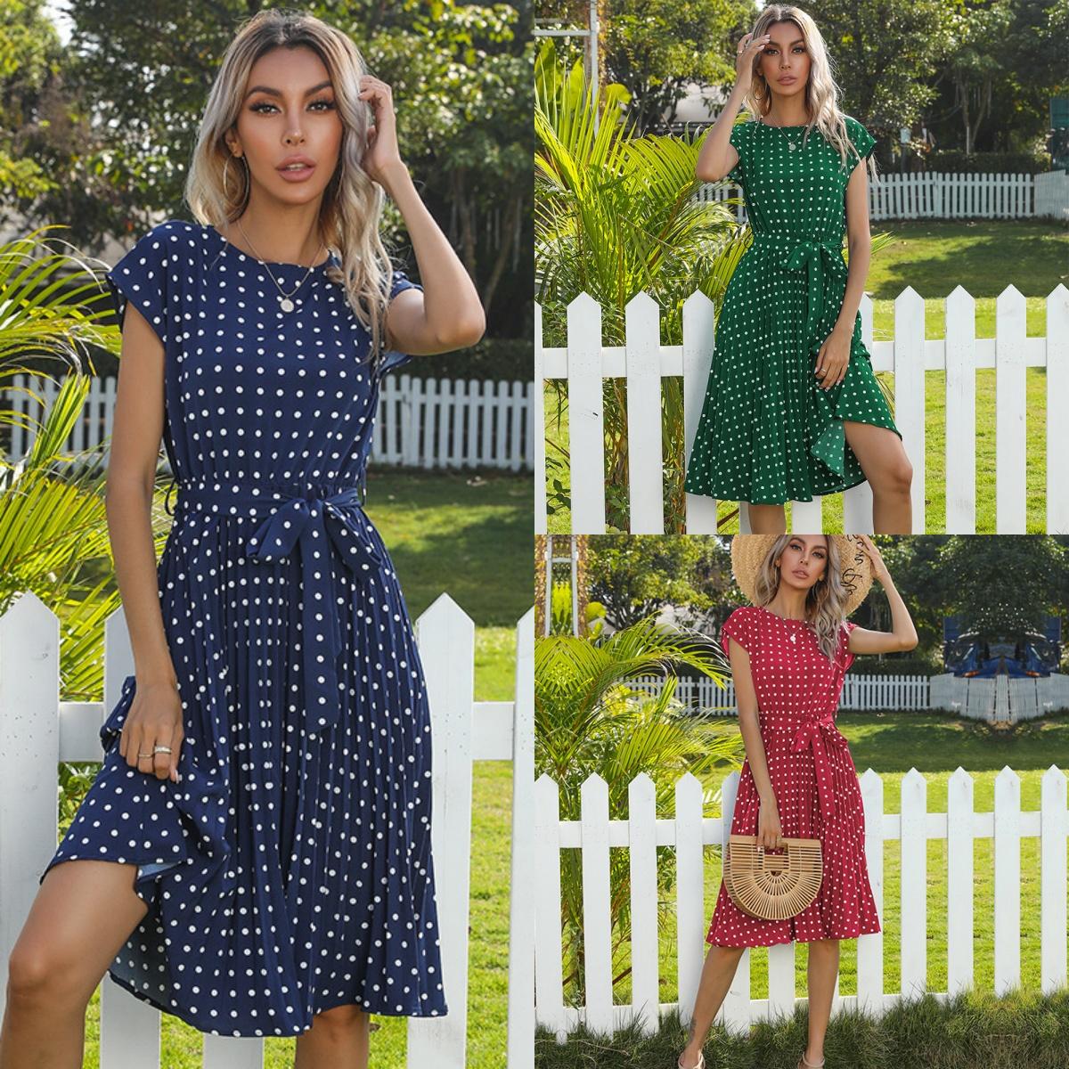 Лето-осеннее длинное платье в горошек, женское повседневное платье с круглым вырезом и коротким рукавом, с высокой талией, тонкий бандажный пояс