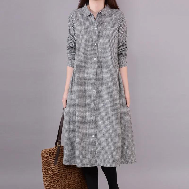 Литературное Свободное Женское Длинное Тонкое Клетчатое Платье Модное Свободное Большого Размера Длинное Тонкое Клетчатое Платье с Длинным Рукавом XL