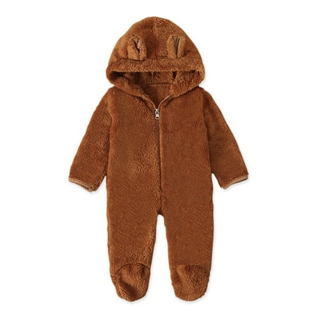 DNDKILG Newborn Infant Baby Toddler Long Sleeve Zip Up Footies for Girl Boy Cotton Winter Warm Fleece Hooded Romper Brown 0-18M