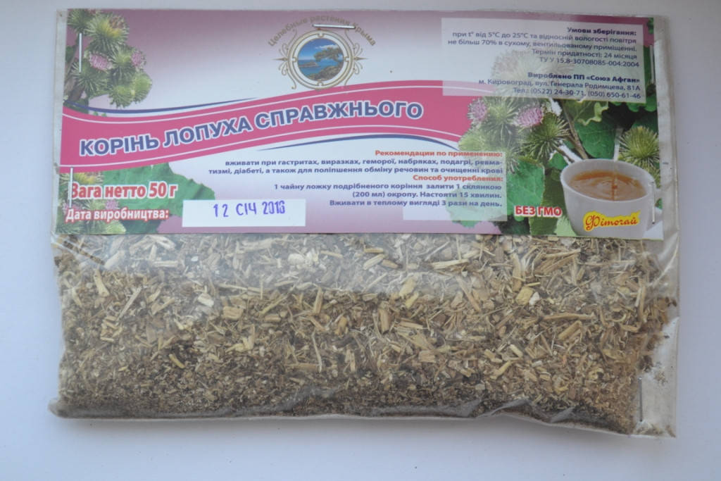 В корнях лопуха обнаружено до 45% полисахарида инулина, 12,3% протеина, эфирное масло, жирное масло, а также пальмитиновая и стеариновая кислоты, ситостерин и стигмастерин, дубильные вещества и горечи. Препараты из корня лопуха стимулируют регенерацию тканей, оказывают желчегонное, антибактериальное и противодиабетическое действия, очищают и обновляют состав (формулу) крови, нормализуют функции желудка и кишечника. Корни лопуха используют как мочегонное средство при камнях в почках, желчном пузыре и мочевом пузыре, отёках, как жаропонижающее и потогонное средство при простудных заболеваниях, как болеутоляющее и нормализующее обмен веществ средство при подагре, суставном ревматизме, геморрое. Настой корня лопуха: 1 столовую ложку корней заварить 300 мл кипятка, настоять в термосе 2 часа. Процедить. Пить по 100 мл 3 раза в день через полчаса после еды при моче- и желчнокаменной болезнях, сахарном диабете, язве желудка и двенадцатиперстной кишки, гастрите, геморрое, ревматизме, экземе, фурункулёзе. Отвар корня лопуха: 1 столовую ложку корней залить 300 мл воды, довести до кипения и кипятить на водяной бане 30 минут. Остудить, процедить. Принимать по столовой ложке отвара 4-5 раз в день между приёмами пищи. Отвар корня лопуха - эффективное средство для укрепления волос при их выпадении, для лучшего их роста, а также при перхоти, зуде кожи головы. Отвар втирают в кожу головы после мытья и полностью споласкивают голову (волосы и кожу головы) и, не смывая, дают высохнуть.