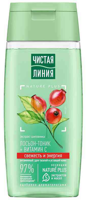 Стрессы и чрезмерная нагрузка приводят к тому, что кожа становится тусклой и безжизненной. Воспользуйтесь витаминным лосьоном-тоником от бренда Чистая Линия после умывания и ощутите, как кожа получает заряд витаминов и бодрости, вновь сияет и выглядит ухоженной.Этап тонизирования необходим для удаления остатков макияже, загрязнений и подготовки кожи к нанесению крема. В составе продукта 97% компонентов натурального происхождения*! Эссенция Nature Plus – Нейче Плюс – это пять экстрактов и масел для ухода за кожей:- Экстракт вербены восстанавливает баланс увлажненности и тонизирует;- Экстракт пиона и льняное масло успокаивают и смягчают;- Масло миндаля содержит жирные кислоты, витамины Е и F, питает и выравнивает поверхность кожи;- Ферментированное оливковое масло питает и защищает от преждевременного старения;- Экстракт шиповника и витамин С тонизируют, способствуют обновлению кожи, придают сияние.Свойства подтверждены результатами потребительского тестирования**:- 93% респондентов отметили, что тоник увлажняет кожу;- 96% – тонизирует;- 92% – заметно улучшает цвет лица;- 94% – заряжает кожу энергией;- 92% – делает кожу сияющей;- 100% – не вызывает раздражение кожи.После этапа тонизирования воспользуйтесь кремом для лица, подходящему вашему типу кожи, а также кремом вокруг глаз Чистая Линия. Одобрено дерматологами. 100% переработанный пластик флакона.*компоненты натурального происхождения отмечены в составе на упаковке.**Свойства подтверждены результатами тестирования: 100 респондентов, min 92% согласившихся, РФ, 2016.
