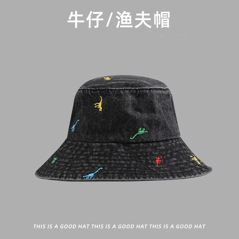 Маленькая вышитая джинсовая панама с динозавриком, женская, для весны и осени, модная, для лица, маленькая, солнцезащитная, для отдыха, шляпа-ведро, студенческая, мужская M(56-58cm) чёрный