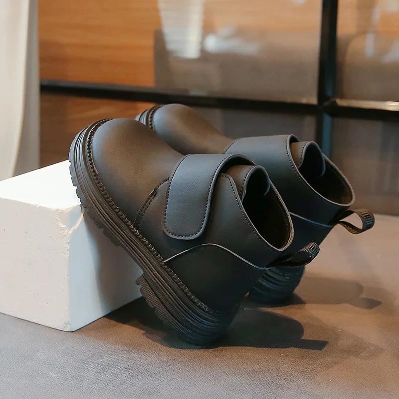 Мальчики Девочки Короткие Ботинки Нескользящие На липучке Детские Ботильоны Грязезащитные 2024 Осень Новые Детские Кожаные Ботинки Однотонные Универсальные 21 чёрный