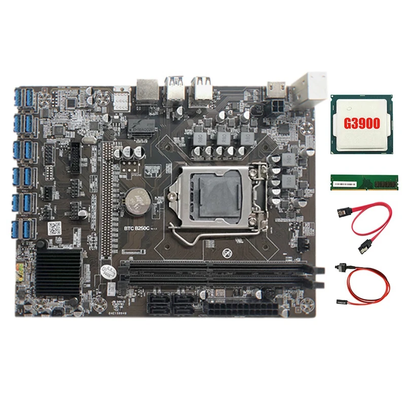 Материнская плата для майнинга B250C с процессором G3900 + 1XDDR4 8 Гб 2133 МГц ОЗУ + кабель SATA + кабель переключателя 12XPCIE на USB3.0 слот для карты