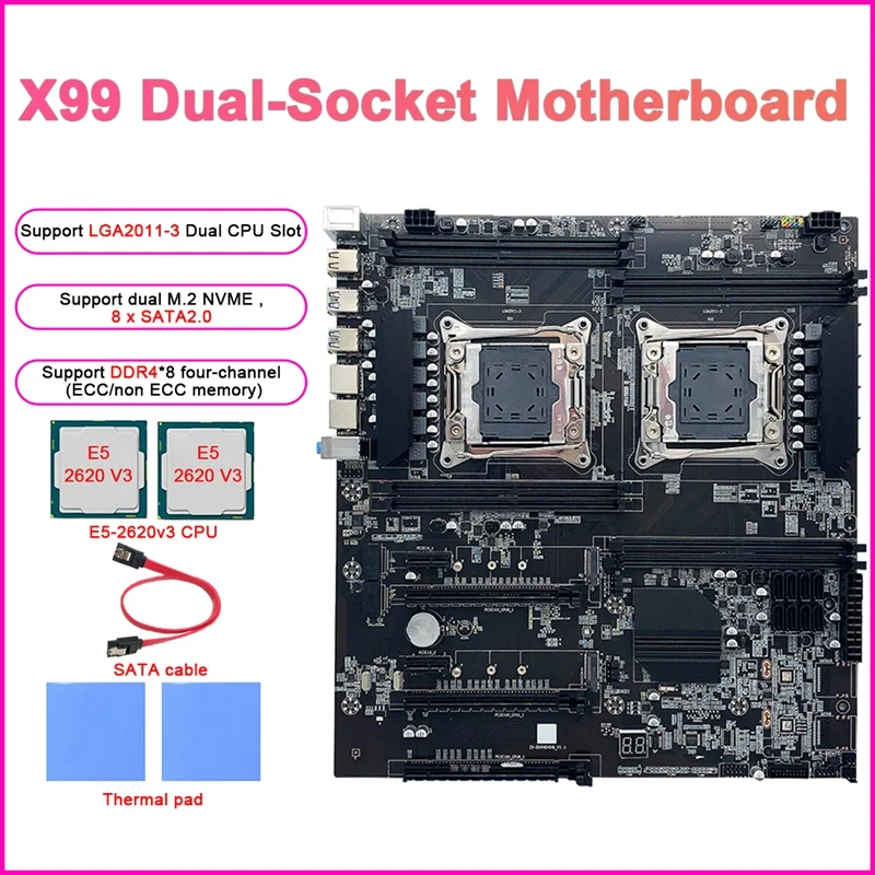 Материнская плата X99 с двумя разъемами для майнинга + процессор 2XE5-2620 V3 + 2 тепловых планшета + кабель SATA Стандартный Двойной процессор DDR4 со слотами ОЗУ 8XSATA2.0