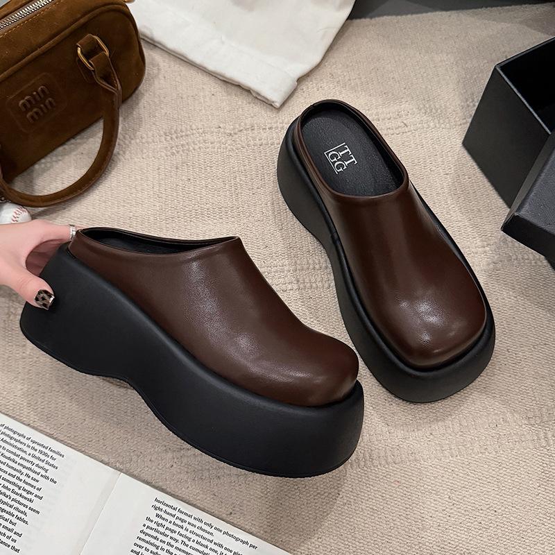Маффины на толстой подошве, с закрытым носком, полушлепанцы женские для улицы, 2025 весна, новая маленькая черная обувь мюли для ленивых на высокой подошве 40