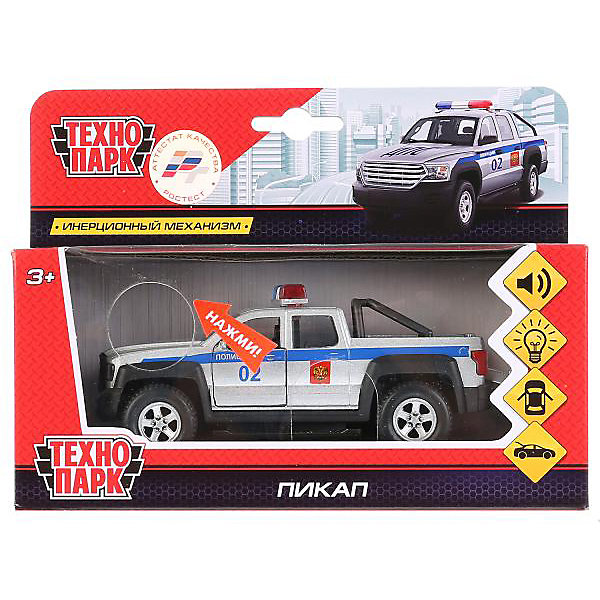 Модель в виде полицейского пикапа имеет реалистичный дизайн. Передние двери и багажник открываются, внутри проработанный салон. Машинка издает характерные сигналы и подсвечивается лампочками. Игрушка может двигаться самостоятельно, если поставить ее на ровную поверхность и оттянуть назад. Сделано из качественных материалов.