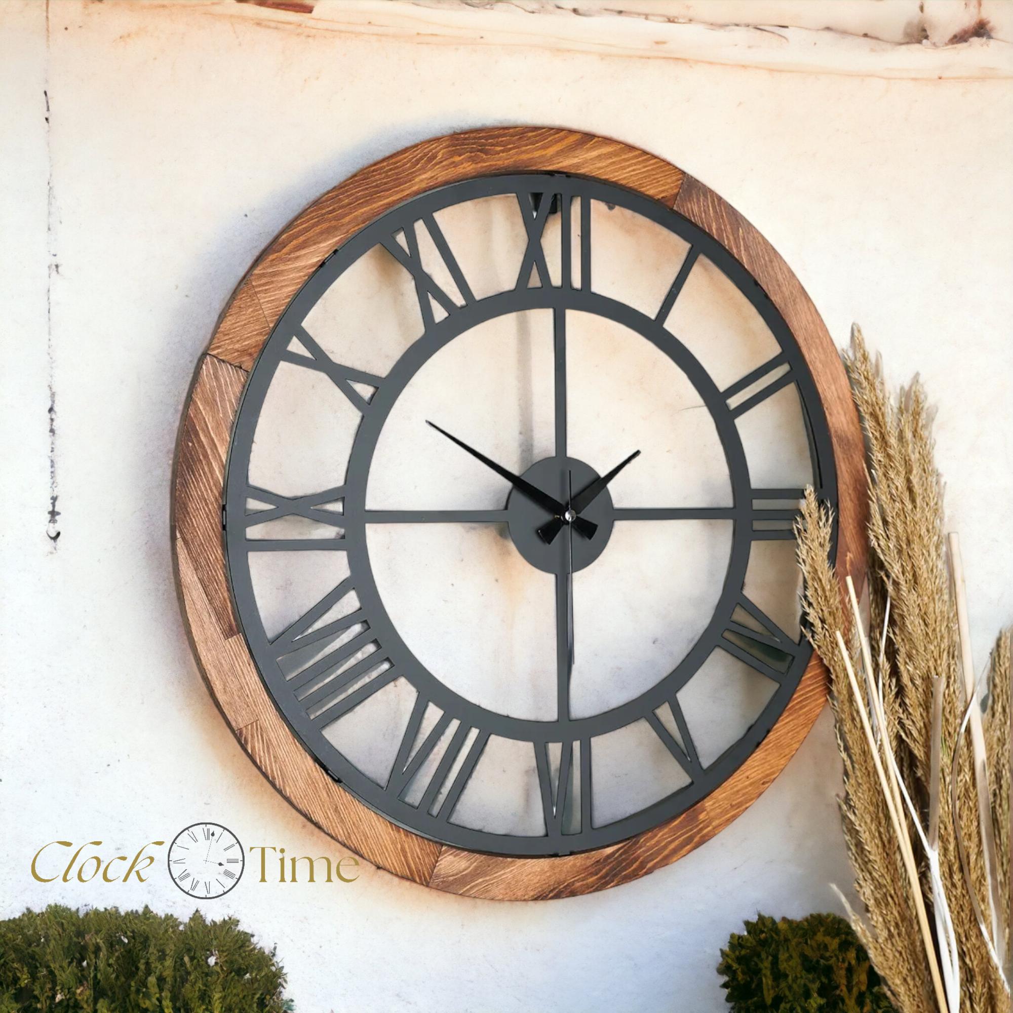 Металлические декоративные черные настенные часы в деревянной рамке с цифрами 55х55см