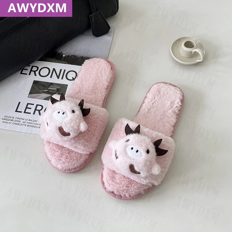 Меховые шлепанцы, мягкие плюшевые сланцы, плоская подошва, Симпатичная модная повседневная домашняя хлопковая обувь, Роскошные теплые тапо...