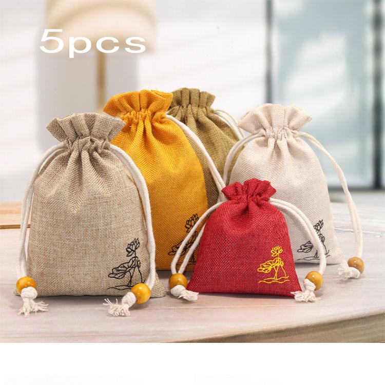 Мешок из хлопкового полотна, льняной мешок, матерчатый мешок, ручная веревочная сумка, сумка для хранения, сумка на шнурке, парчовая сумка, культурная сумка, сумка для тарелок с бусинами 5pcs/Small