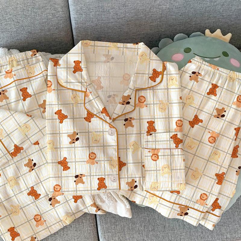 Милая Милая Домашняя Животная Клетчатая Пижама Женская Летняя Мятая Ткань Короткий Рукав Повседневная Свободная Домашняя Одежда Комплект из Трех Предметов M