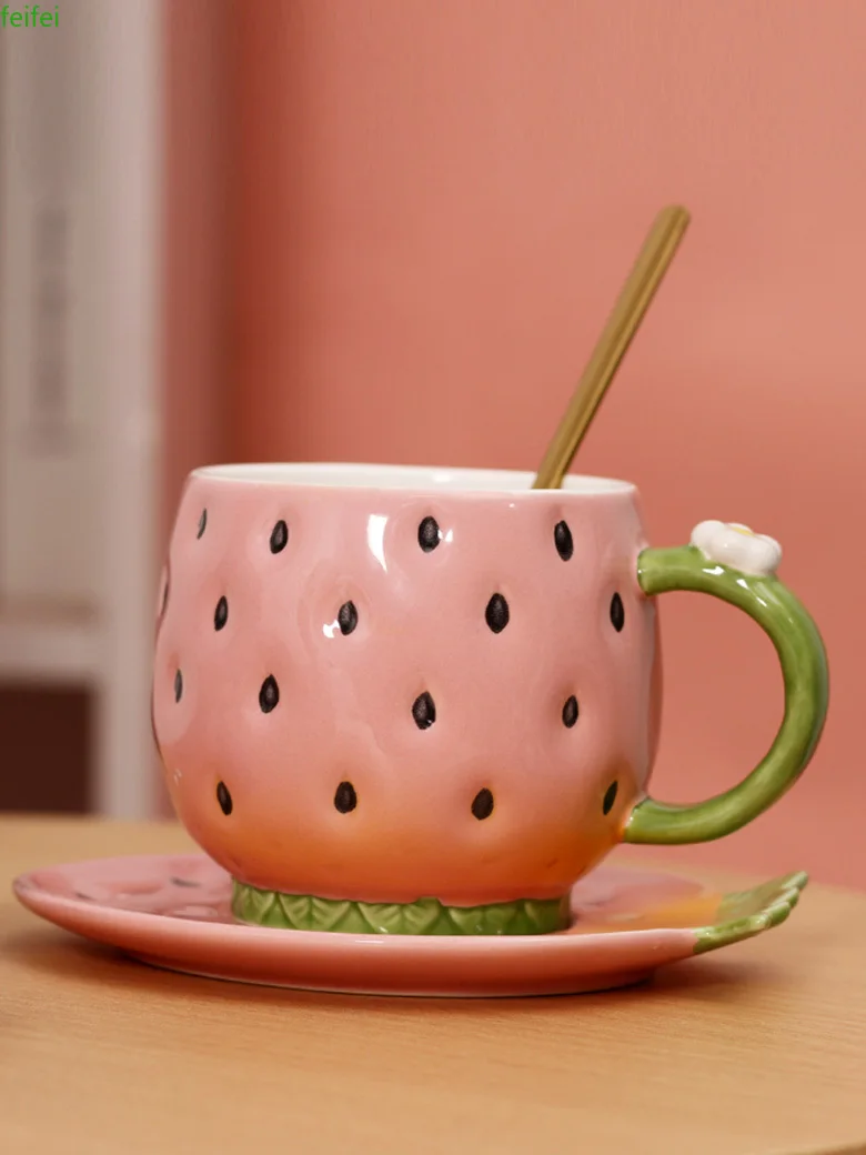 Милая Клубничная чашка в скандинавском стиле, розовая креативная керамическая чашка высокого качества с ложкой и ручкой Koffiebeker домашняя ча...