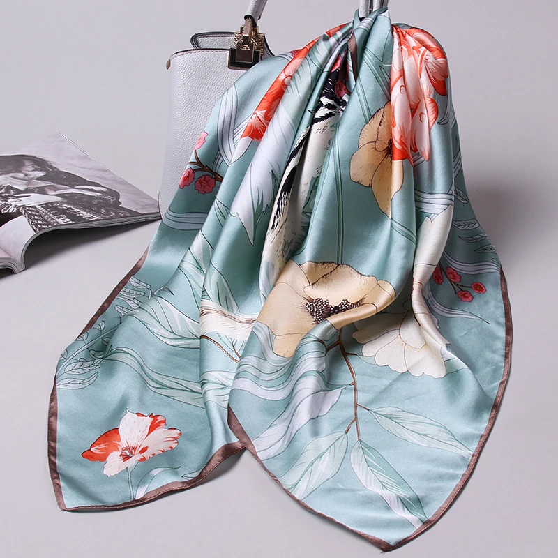 100% Real Silk Square Scarf Women Flower Print Silk Shawls Wraps Large Natural Silk Neckerchief Headscarf For Ladies 88X88cm