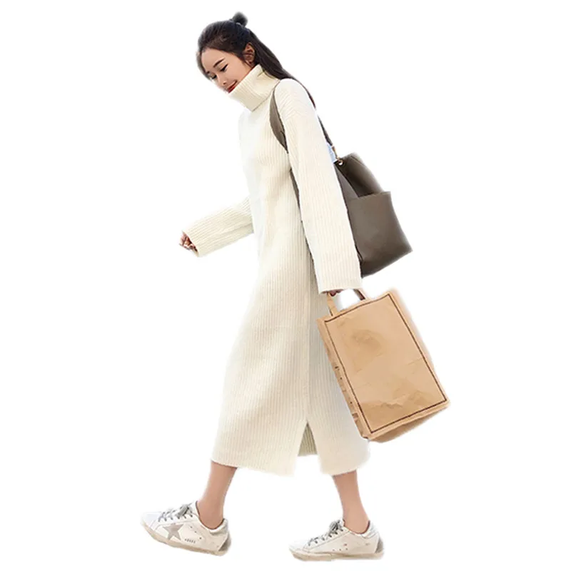 2018 Turtleneck Warm Autumn Winter Long Sweater Dresses Female Casual Loose Knit Pullovers Ladies Thick Split Knitwear Tops A38