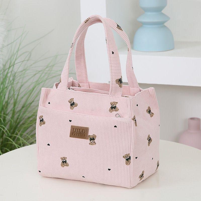 Милая вельветовая сумка с принтом медведя, универсальная, сумка для ланча для офисного работника, сумка-тоут розовый