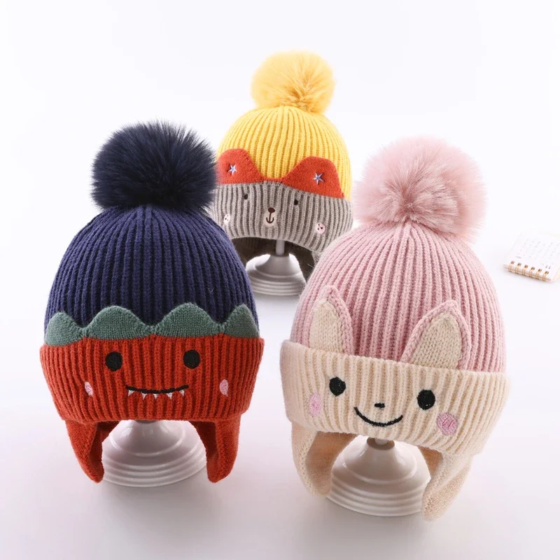 Милая детская зимняя вязаная шапка, ветрозащитная утолщенная теплая шапка-бини с наушниками, защитные шапки для ушей с героями мультфильмов для маленьких мальчиков и девочек