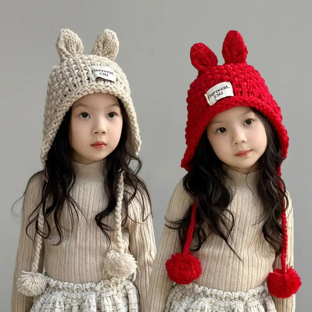 Милая однотонная детская вязаная шапка крючком, мягкая теплая шапка с кроличьими ушками, вязаная вручную шапка на осень-зиму, уличная защитная шапка для ушей для малышей