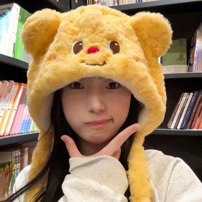 Милая плюшевая шапка-медвежонок с маслом, женское лицо, маленькая, осенне-зимняя, защита от холода, теплая, универсальная, с защитой ушей, большой обхват головы жёлтый