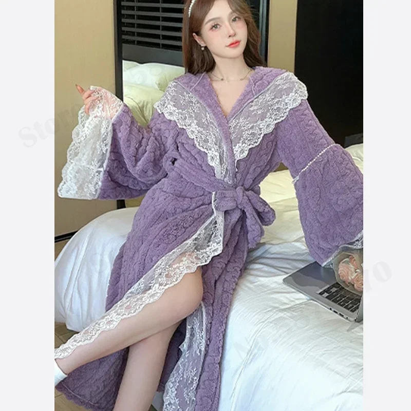 Милая сексуальная кружевная ночная рубашка из кораллового флиса, плотный длинный халат, новая зимняя теплая одежда для сна, женское нижнее белье, кимоно с капюшоном, халат