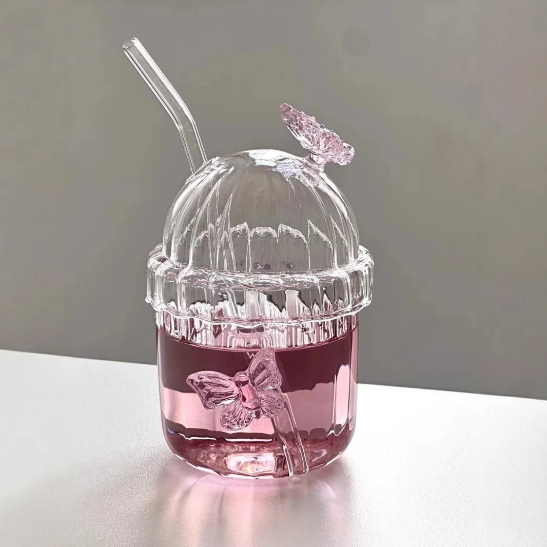 Милая соломенная стеклянная чашка-бабочка, розовая летняя чашка для сока, молока, воды, высокий уровень внешнего вида, устойчивая к высоким температурам чашка для чая с молоком