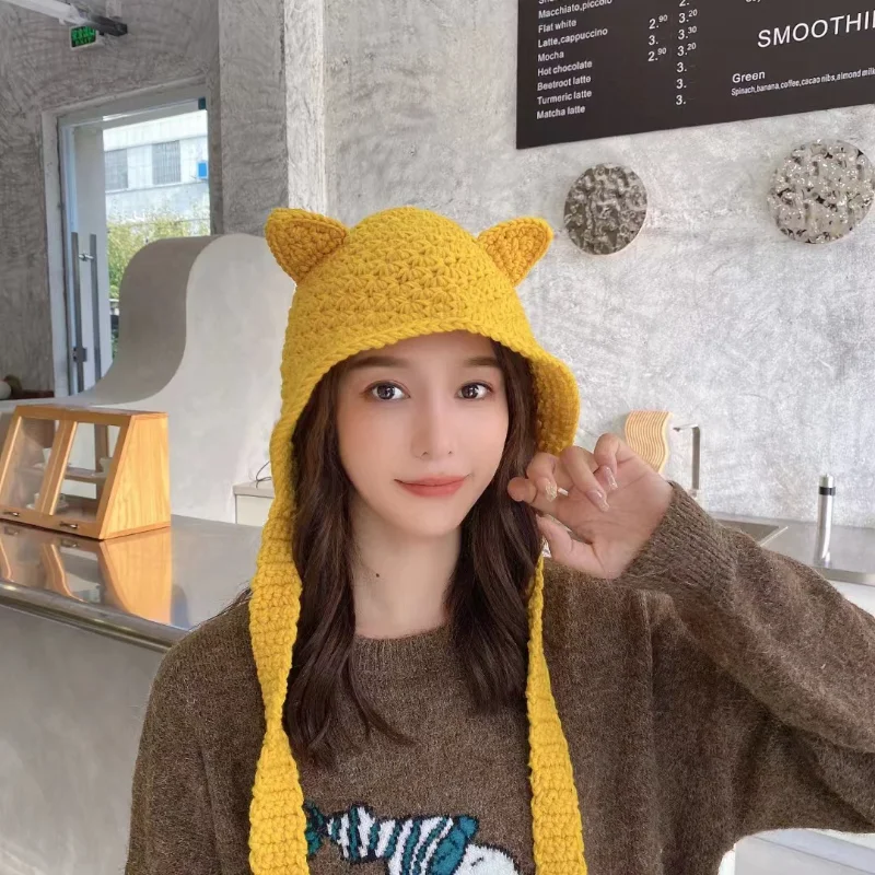 Милая теплая однотонная полосатая вязаная крючком шапка ручной работы осенне-зимняя ветрозащитная шапка для защиты ушей Женская перуанска...