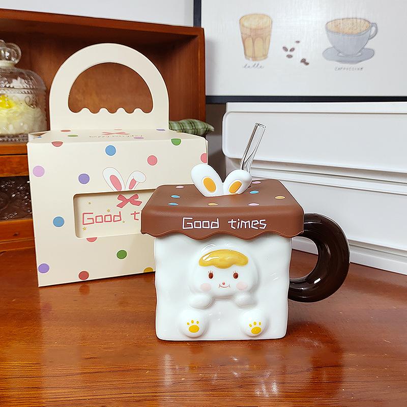 Милая трехмерная кружка с кроликом, с крышкой и соломинкой, креативный подарок для девушки, квадратная керамическая кружка для завтрака, для офиса 450ml