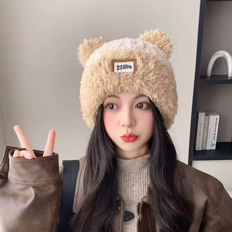 Милая шапка-пуловер с медвежьими ушками детская зимняя модная теплая утолщенная пушистая шапка с защитой ушей вязаная шерстяная шапка