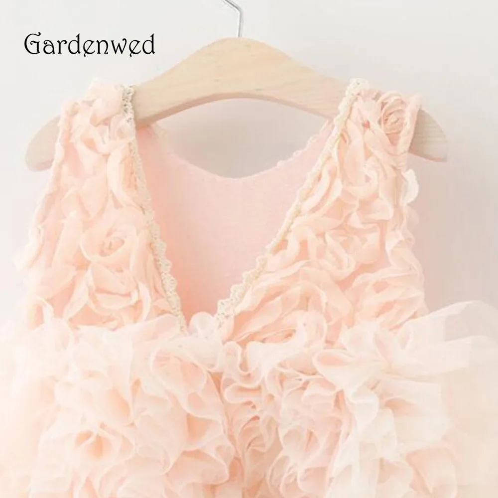 Милое Тюлевое платье для девочек, с цветочным принтом, Короткое бальное платье до колен с V-образным вырезом, платья для первого причастия, пышное с оборками