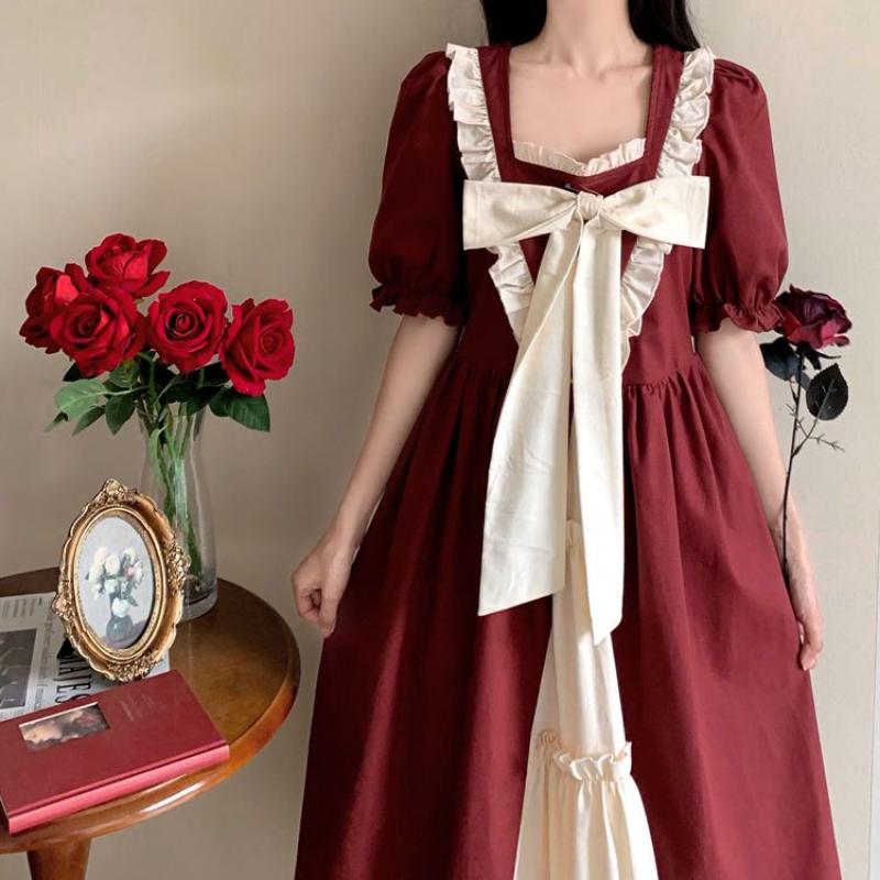 Милое платье с бантом в студенческом стиле для девочек, студенток, маленькая, свежая, с объемными рукавами, трапециевидной формы, большая распашная юбка, юбка выше колена XL красный