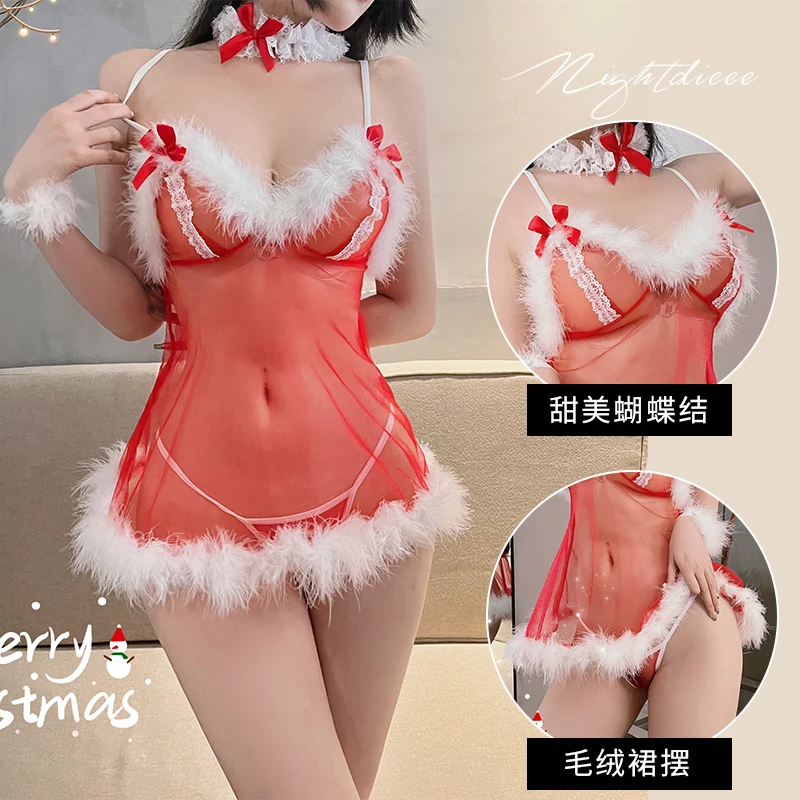 Милое рождественское платье для сексуальных девушек, пушистая прозрачная ночная рубашка с лямкой на шее, постельное белье без снятия, эроти...