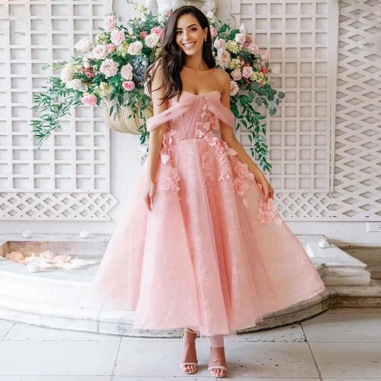 Милое розовое ТРАПЕЦИЕВИДНОЕ платье для выпускного вечера с открытыми плечами, кружевное вечернее платье с аппликацией, пышные тюлевые нар...