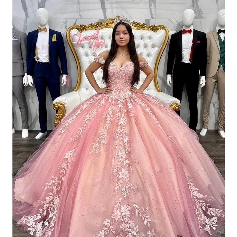Милое розовое блестящее платье Quinceanera, кружевное платье с аппликацией и открытыми плечами для девушек 15 16, вечерние платья на день рождения, ...