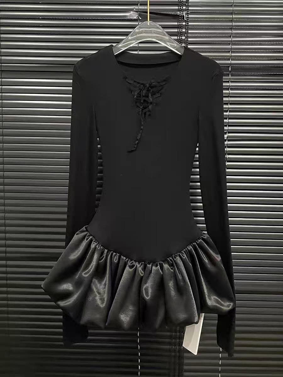 Милое и шикарное платье с круглым вырезом на шнуровке и юбкой-тюльпаном - Длинный рукав, Высокая талия, Вырезной стиль Small чёрный