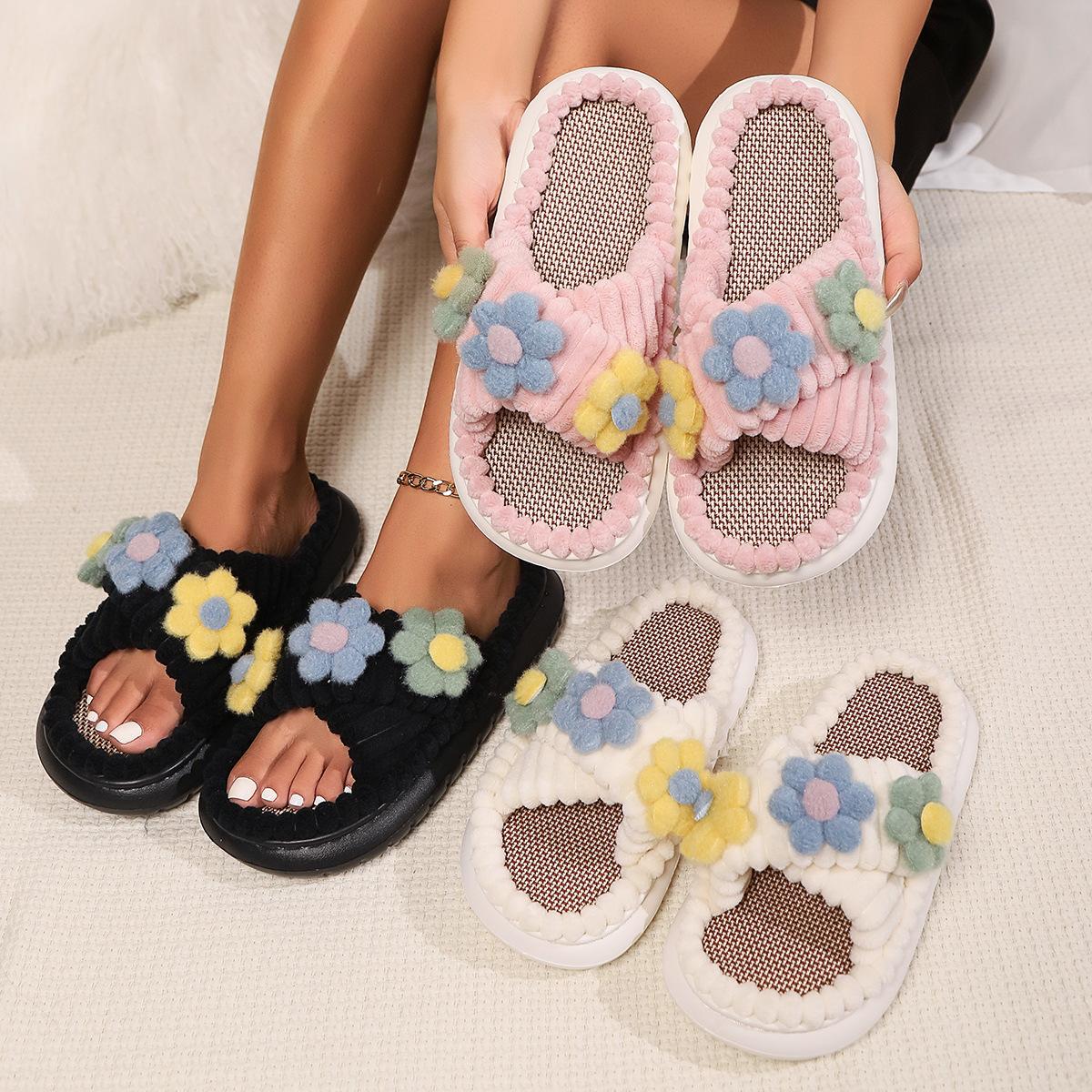 Милые красочные цветочные декоративные тапочки с перекрещивающимися открытыми носками, открытые носки, мягкая подошва, льняная толстая подошва, удобные домашние тапочки