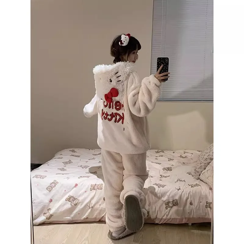 Милые и милые пижамы HelloKitty для девочек, зимняя утолщенная бархатная коралловая модная уютная домашняя одежда, комплект брюк с длинными рукавами