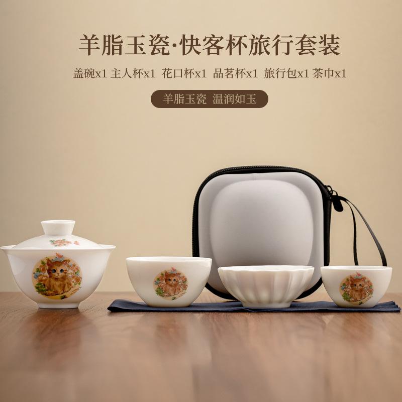 Милый кот овца жир нефрит фарфоровый чайный сервиз набор ручной работы 1 горшок 3 чашки для приготовления чая кемпинг на открытом воздухе портативная сумка чайная утварь орнамент
