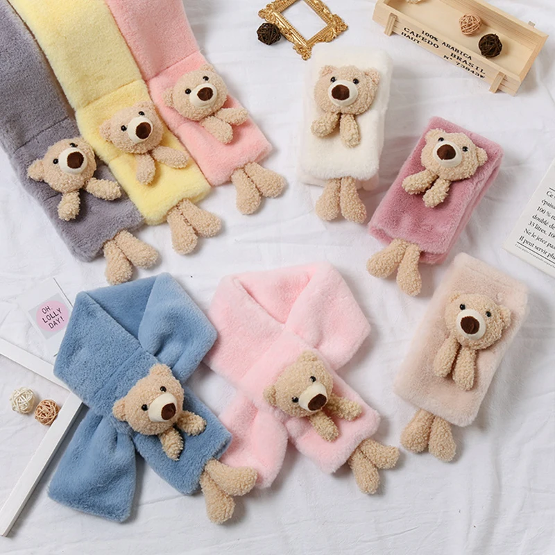 Милый плюшевый шарф с мультяшным медведем для детей, перекрестная шея, кольцо, воротник, шарф, зимние теплые шарфы из искусственного кроличь...