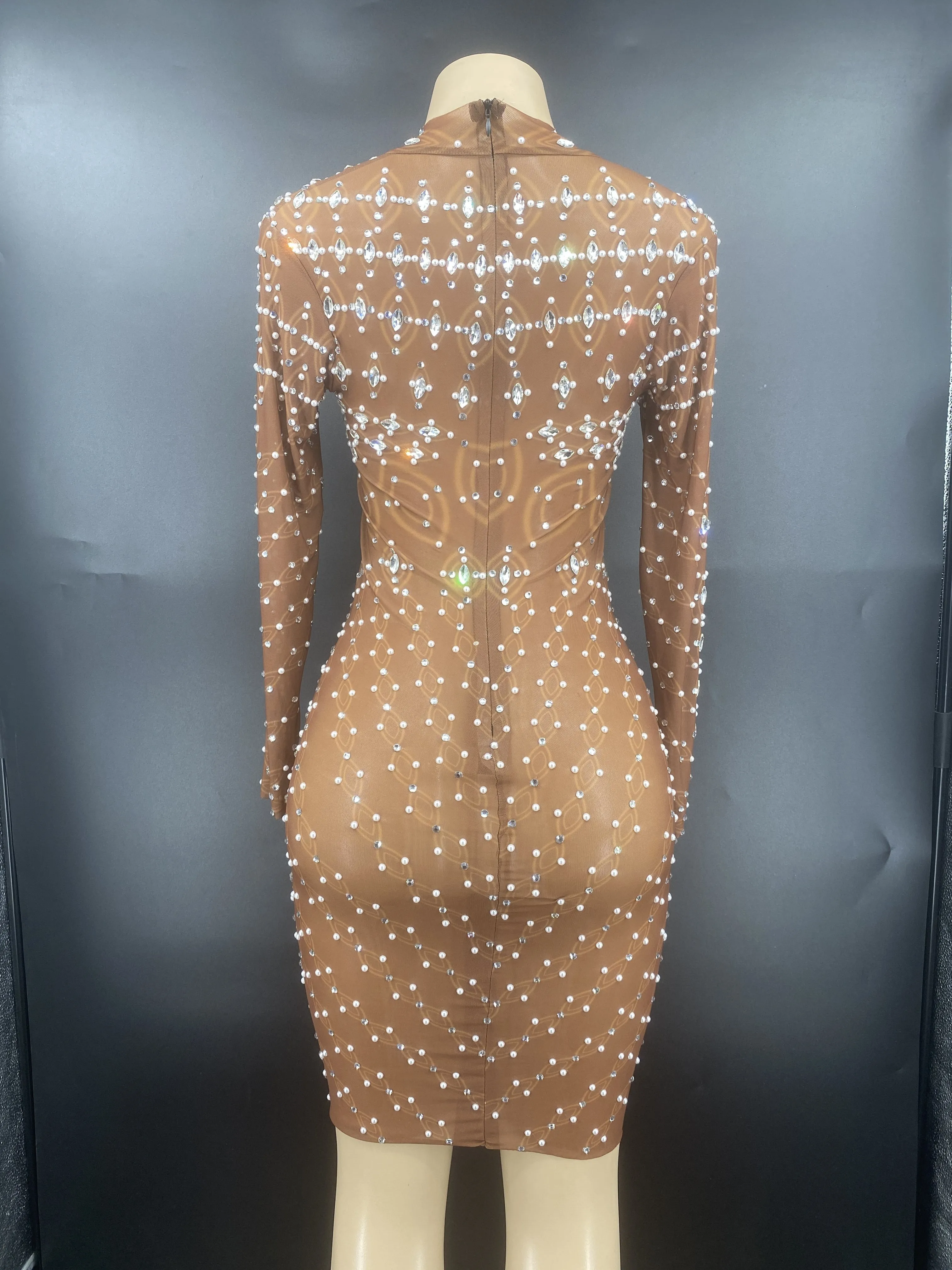 Мини-платье серебряное Стразы с жемчугом, женское Сетчатое Прозрачное платье певицы, платье для празднования дня рождения и выпускного веч...
