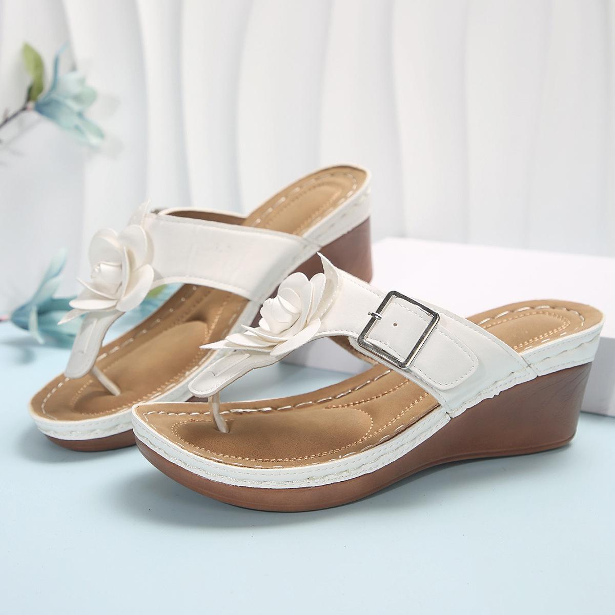 Многолетние пятна, большие размеры, летние новые туфли на танкетке, женские тапочки на толстой подошве с цветочным принтом, пряжкой на ремне, носок с узором «елочка», классные тапочки 36 белый