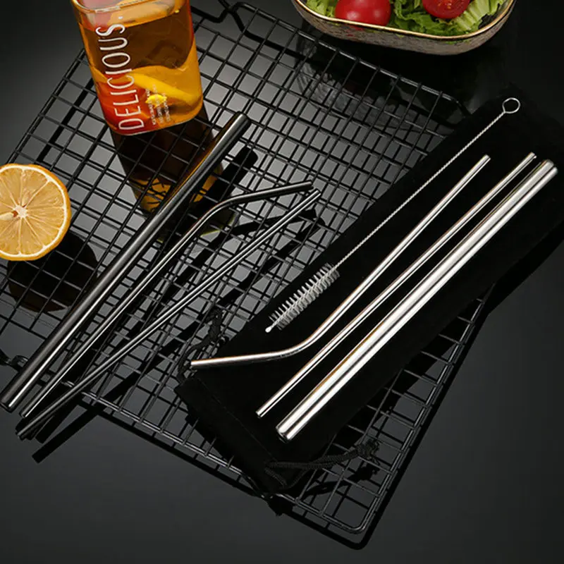 Многоразовые металлические Сменные питьевые соломинки из нержавеющей стали, прочные изогнутые прямые соломинки для напитков с чистящей ще...